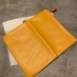 10in clutch. Foldable with mustard leather and a floral canvas. Inside has a pocket with a smooth zipper closer