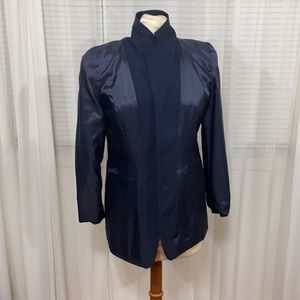 70% Rayon, 30% polyester, navy blue blazer. Functional pockets, fully lined, button accents on sleeves. Small patch of what looks like fusible interfacing in on the underside of the collar, not visible when worn properly, I have not attempted to clean or remove it. Garment is otherwise in excellent condition, is dry clean only. Smoke free cat friendly home.