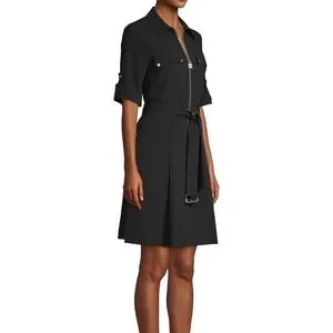 A lock zip front gives this flattering MICHAEL Michael Kors shirtdress modern style. Stay casually chic when you style this figure-flattering frock with strappy high heel sandals and a waist belt.