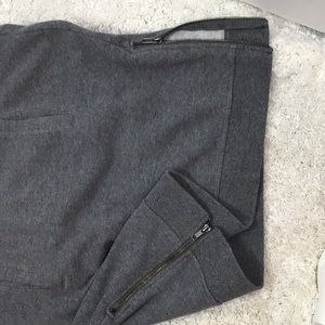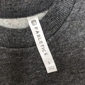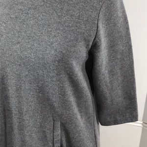 Cotton/poly blend, some stretch, fleece inside, gray, 3/4 length sleeves, short zippers on the sides at hemline, minor pilling, pockets, Fabletics, size S, measured flat app: pits 19”, shoulder to hem 32”, GUC, wear as a tunic with leggings or as a mini dress (T-19)