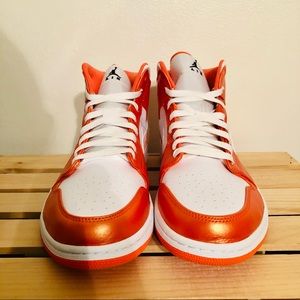 The Air Jordan 1 Mid SE 'Electro Orange' features a vibrant look on its classic basketball construction. The shoe's upper is built with leather, finished in white and highlighted by metallic Electro Orange overlays throughout. The 'Wings' logo on the collar contrasts the look in black, while underfoot, the white and Electro Orange look continues onto the tooling, comprised of an Air midsole and concentric rubber outsole