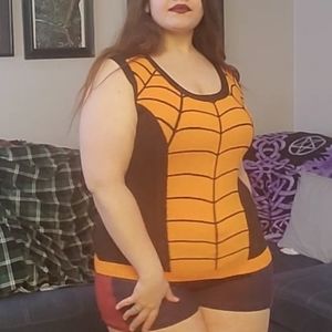 Made from a stretchy lycra acrylic/poly blended yarn Knit, this shell will fit you like your very own spider-suit.