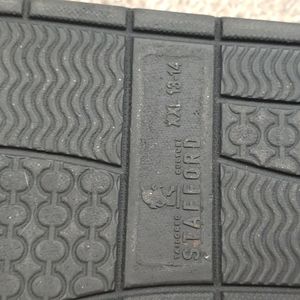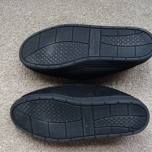 Black suede type material on outer shell. Comfy black and gray check pattern on interior. Rubber sole. Size is XXL covering size 13-14