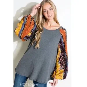 FLORAL WOVEN AND SOLID WAFFLE MIXED ROUND NECK PUFF LONG SLEEVE TOP!