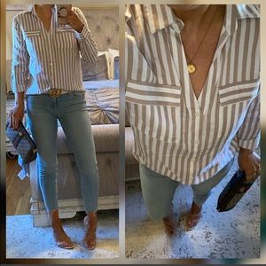 New๐คKhaki/white striped v button down