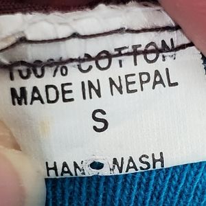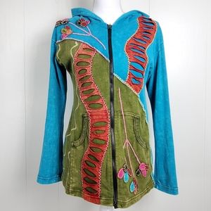 This high quality jacket is made by KPC. It features a hippie festival style, zipper front, hood, and is a size small. It has approximate measurements laying flat from armpit to armpit of 19.5", waist is 17", shoulder to wrist is 21.5", front length is 22.5", and back length is 24.5". It has no signs of wear or damage. Item # J0001476