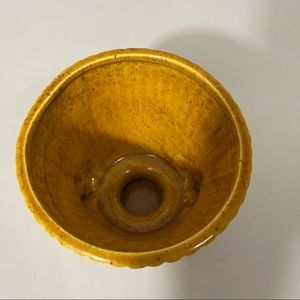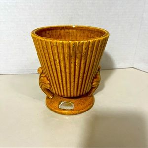 Vintage Haeger USA Mustard Yellow, Brown Speckled Footed Vase/Planter; stamped USA # 128. Original firing spots on bottom. Approximately 5.5” tall, measures 5” across opening & 4” across bottom.
