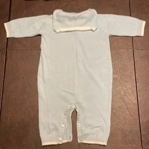 Super cute footless one-piece in excellent condition with a sailor accent flap at the top of the back. Clean with no stains. Size 0-3 months in baby blue.
