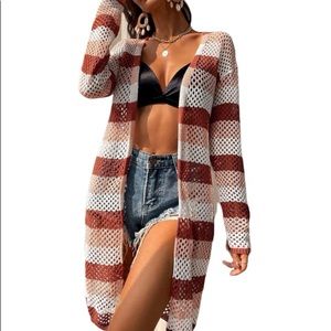 Terracotta, Apricot, and Cream color stripes in a Pointelle Block Knit Design come together to make this the perfect going into spring Cardy!! Perfect to wear over a simple cami with long jeans or shorts. Great layering piece for any outfit including chilly summer nights. Can even be worn as a beach or pool coverup. It is semi sheer due to the lighter open knit design. It is beautiful, soft, and my personal fave. It runs true to size so if you want a little oversized size up one size. Feel free to ask any additional questions. Thanks for looking and happy poshing!!