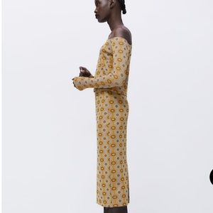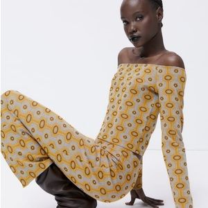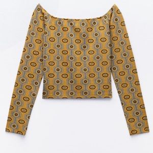 High-waisted Jacquard Top & skirt with elastic waistband. Set Straight neck top with long sleeves and exposed shoulders.