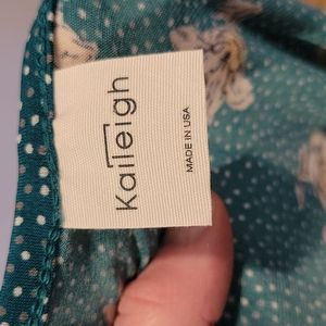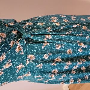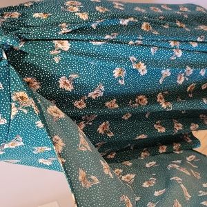 Poly/Spandex blend and so fun and feminine. Flowy Skirt and faux wrap. Short Sleeve, v neck. Perfect condition.