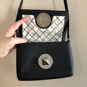 Small black Newbury Lane crossbody purse from Kate Spade with adjustable strap, textured leather, white lining with black pattern, gold hardware, inner pocket, flap, and rotating pyramid clasp. This is a reposh and I’ve never worn it. There is a tiny spot on the flap lining and some wear on the clasp, as pictured. Approximately 5 inches tall, 8 inches wide, and 1 inch deep. The strap adjusts from about 43 inches to 47.5 inches long. 100% cow leather exterior. 100% polyester interior. Smoke free and pet friendly home!