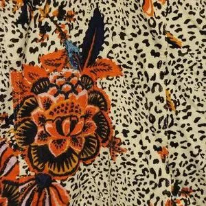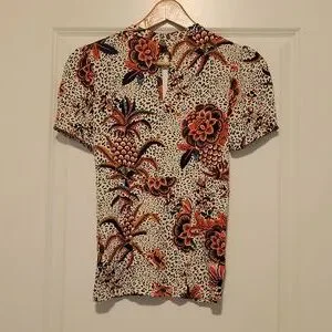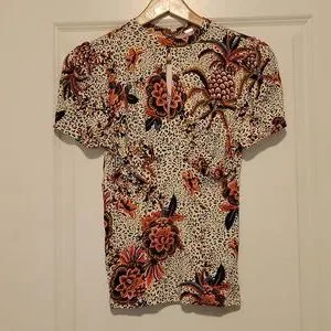 Free People short sleeved, floral/animal print blouse, stretchy material, snap neck closure.