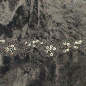 Excellent condition. Black velvety evening gown. Waist 19" but can be drawn in smaller with back of dress belt ties. High waist applique with sequins & beading. Attached shoulder pads. Great from Holiday parties, cruise ship dress up evenings, Homecoming, Prom, or any other special event. See photos.