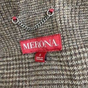 In pristine condition. Vintage made in Vietnam. Lightweight, Brown, Plaid, Wool, tweed, with brown, suede, elbow patches. Large shawl collar. Two deep front pockets, fully lined. Liner is champagne in color. Merona made in Vietnam was considered a higher end brand and sold at Dillards far before Merona contracted with Target and was then made in China.