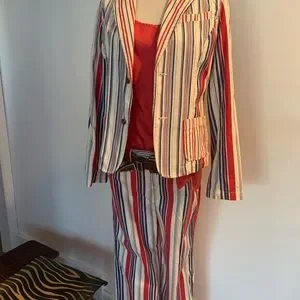 So mod! And so many ways to style this super cool jacket and pants. Two button jacket, kick pleat in neck. Two root lower pockets and one Chest pocket on jacket. Pants are cropped and have two side pockets.