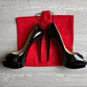 Christian Louboutin Heels Black Patent Lady Peep Toe Pumps 10.5 Red Bottoms