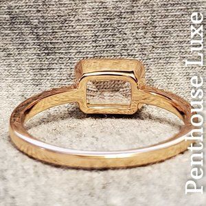 Beautiful emerald cut morganite in a bezel setting with brilliant cut white topaz accents in prong settings. SOLID 925 sterling silver with an 18k rose gold overlay (stamped "S925"). All photos are real and unedited.