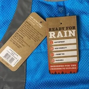High visibility raincoat by Arcadia Trail. New with tags. Various sizes. Comes with carryall bag and carabiner clip.