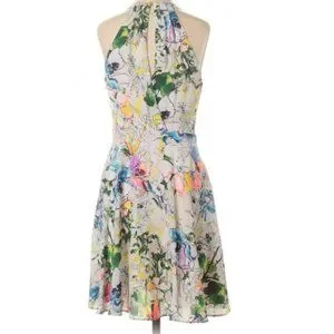 Gorgeous cream colored sleeveless mini dress with multicolored modern flower print that includes blue purple white black green & yellow - gathered high front neck with back crossover cutout back - lined in cream with hidden side zipper & neck hook closure - new condition with no stains or holes