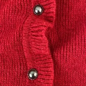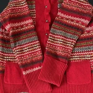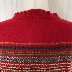 This is a really warm winter cardigan sweater as it is 70% lambs’ wool! It has beautiful black buttons, two front pockets and cuffed sleeves. It is a mix of red, white, browns, black and gray, so it can be worn with many different colored outfits. It’s a little dressier than your average winter sweater with a slight ruffle around the neck and down the placket. A really wonderful sweater! Well taken care of!
