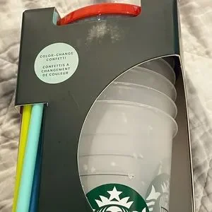 This is the full set of Starbucks color changing confetti cold cups. 5 reusable 24 oz. cold cups with lids and straws. Brand new in box. Summer 2021 Starbucks. Make me an offer & please check out my other items as I have more Starbucks, clothing, shoes, accessories and makeup!