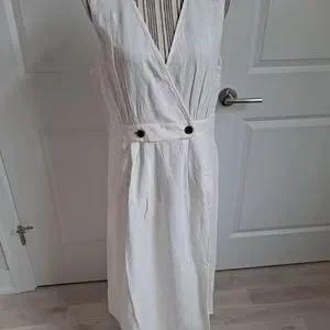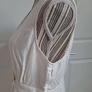 Off white linen tank dress, two buttons in front, elastic waist in back, midi length, side zipper, unlined.