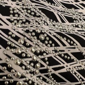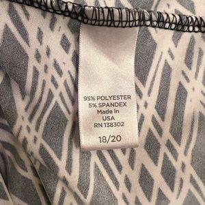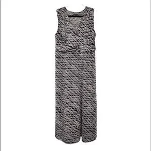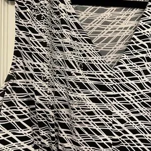 This is such a pretty dress! It’s Sleeveless, Black and White and It’s a Size 18/20. Has some ruching on the waist band and perfectly accentuates your waist. Has a V neckline, and some silver tone bling on the upper left side. Measures 22” armpit to armpit, 19” across waist, and 55” long! Super easy to care for, never needed to be ironed!