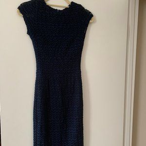 Cap Sleeve, stretchy fabric with lacy overlay. hidden back zipper. Color: navy Size: Small Length 39", chest 14", waist 12"