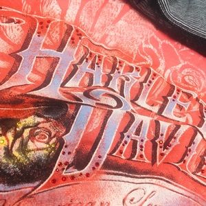 Brand New With Tags Harley Davidson Limited Edition Lace-Trim Women's Mix-Print Graphic Top - Size L. Top features a rounded scoop neckline, 1/2 sleeves, black lace detailing around neckline and down sleeve tops, Coral pink Cotton fabric front w/ Harley Davidson nostalgic graphic, and striped fabric on back and on sleeve undersides. Scattered Red and Gold Rhinestone Studded accents on the Harley Davidson Shield and Lettering. The tag color says orange but looks more Coral in color. Measures approximately Length: 26.5 Bust: 36 Waist: 37.5 Ready to roll off to new adventures!