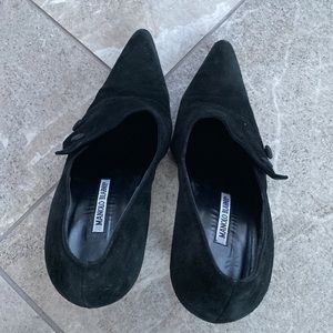Manolo Blahnik Black Suede Pointed Toe Leather Heels With Button Detail Size 7.5