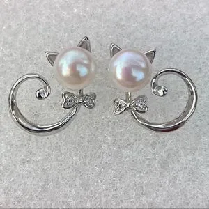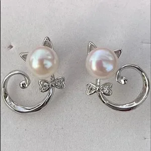 NEW 925S Silver Real 6mm Cultured Freshwater Pearl Cat Shape Stud Earrings