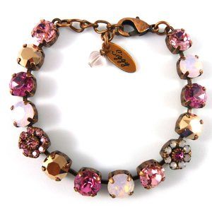 Cute flower embellished bracelet made with genuine Swarovski crystals in pretty shades of pink including rose water opal, rose gold, and rose. The finish is antique copper which is nickel-free. A cute pink heart charm and the Siggy tag complete the look.