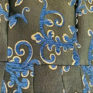 Beautiful color combination: black background is accentuated by sapphire blue and gold colored florals