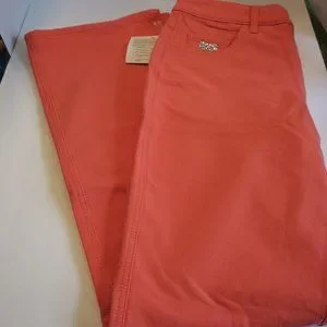 Quacker Factory Dream Jeannes pants features fly front closure, belt loops, and five pockets. 96% cotton and 4% spandex. Generous fit. Hand wash recommended but I always machine wash and hang dry these items. Measurements as follows: Waist 30 inches, Hip 40 inches, inseam 31 inches, Leg Opening. NWT