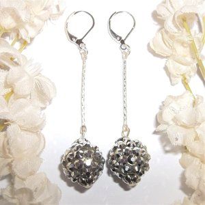 You will love the long length of this beaded earring set. Brand new & handmade by me - wvluckygirl. Done with sparkling pave beads that resemble a disco ball. They also have antiqued silver toned costume jewelry beads. The stiff stick bar is diamond cut & sparkles in the light. The pair dangle & drop from 925 sterling silver lever backs for women's pierced ears. 2 5/8 inches tall & 1/2 inch wide. Each single earring weighs 2.2 grams. Lightweight! A must have. Buy it now before someone else does!