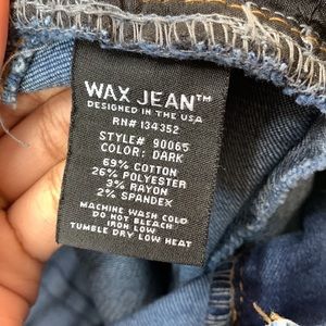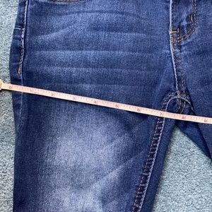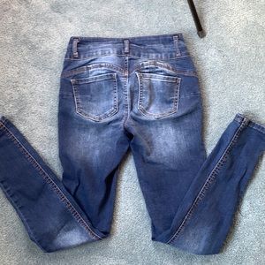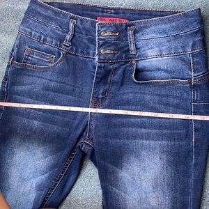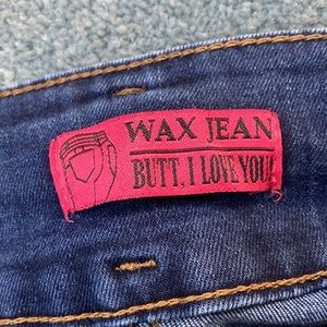 Cute denim wax jean Butt I Love You brand size 3 dark blue skinny jeans made in China and designed in the USA. Measurements below and in pictures. Pre-owned. Has 2 buttons and one zipper. 2 front pockets and 2 back pockets. Machine washable. Material is 69% cotton 26% polyester 3% rayon and 2% spandex. Perfect casual jeans for any occasion. A few threads on the side and some discoloration but overall in good condition. Contact me for any questions or concerns.
