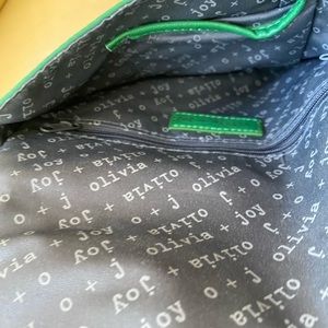 Olivia + Joy crossbody nylon purse. It is made of nylon and the color is a Kelly green. Perfect for ☘️ day. It has a 22” drop handle and has a 9” length x 10” wide. It has a small stain on the inside (picture). It has a zipper on the outside to make more room inside if you need it.