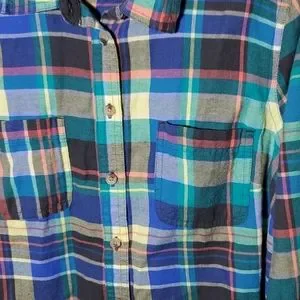 Size M Sonoma flannel shirt. 2 Front pockets. 100% Cotton. Excellent, very gently used condition. Multi colored, Blue, Green, Yellow, Salmon, Black & White.