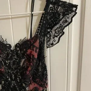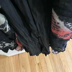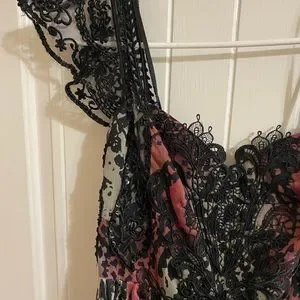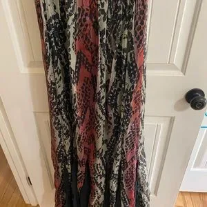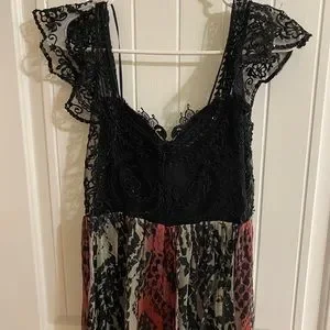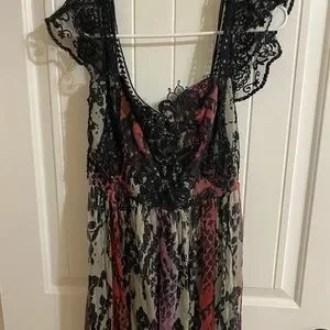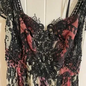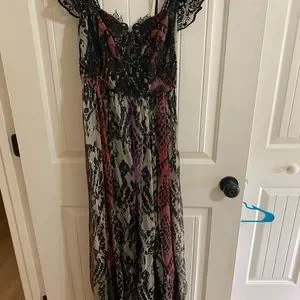 Free People Wild Hearts Maxi Dress really stunning on. Size 6 but I am size 8 mostly and it fits me well. Black red grey and purple. I wore one time to bridal rehearsal