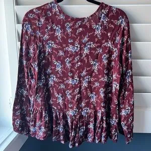 American Eagle Outfitters size small blouse. Maroon color with blue flower design. Small cutout on neckline and cinched sleeve hole.