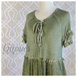 Designed in a Relaxed fit, A Mineral Washed Midi to Mini (depending on Height) Dress in POL's own Specialty Hand-made wash to achieve a Truly Bohemian VINTAGE Burnout Look and Super Soft Feel. Features: Mesh Lace Panel over the Skirt, Lattice Front Tie, Ruffle Detail, and Raw Edges.