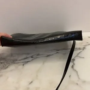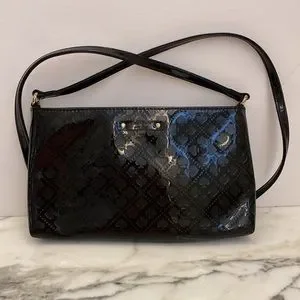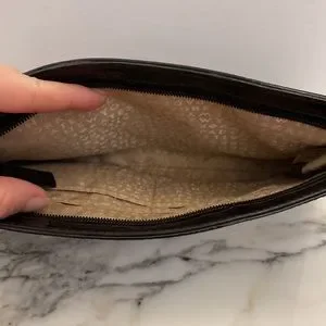 Measures 10 across six deep, strap drop of 22 inches has four credit card slots and zips!