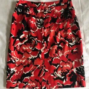 Beautiful soft silk blend skirt in red, black and white pattern. Back slit.