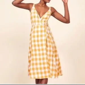 Color: Jeune. REFORMATION BEVERLY DRESS. Easy breezy wrap dresses. . This is a midi length, wrap dress with a deep v neckline and a side slit. Midi length. Not bra friendly.