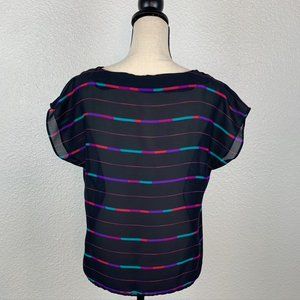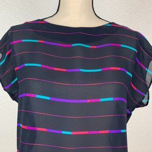 Vintage 1970s shear top. Black with multicolor neon stripes. Loose fitting. Very cute!!