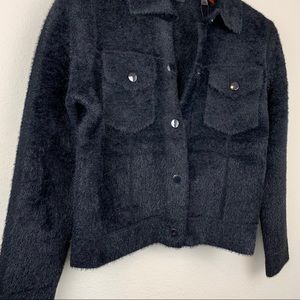 Super soft fuzzy jacket with lots of stretch and a wool look. Feels like your wearing a sweater. Let me know if you have any questions!