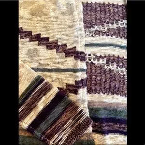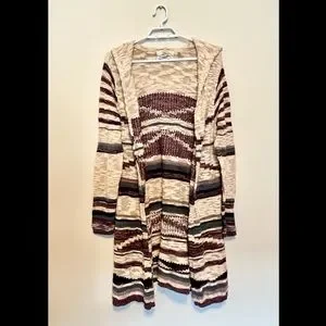 This long sleeved knee length hooded cardigan is Point Zero, it is a size Extra Large, the colour is Cream with purple blue pink and green design throughout, it is in great condition, the cardigan’s material is 84% Cotton 8% Rayon and 8% Nylon.