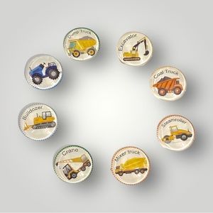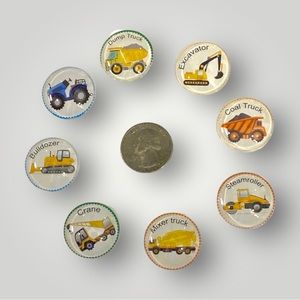 Set of 8 construction vehicles on 1” magnets. Handcrafted, bright images on glass gem magnets. They will come packaged in a pretty organza bag ready for your personal use or for gift giving. Ideal for school, office or home!