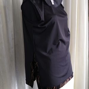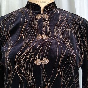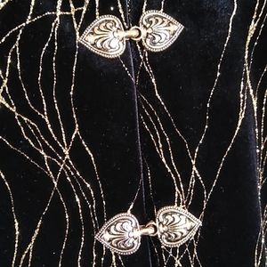 evening blazer , velvet look with gold accent print and old gold metal clips very elegant . like new condition from smoking free home.